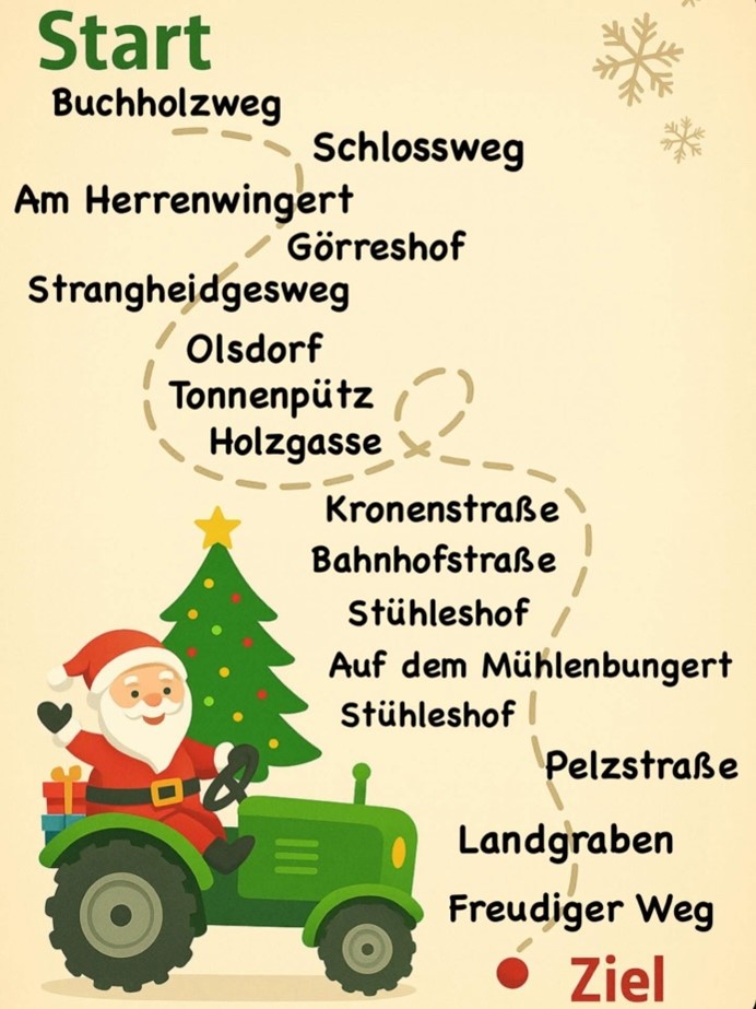 Der Zug mit ca. 20 weihnachtlich geschmückten Traktoren führt über folgende Strecke: