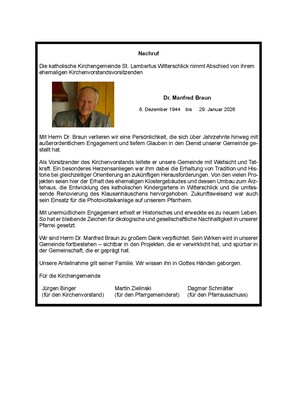 Wir sind Herrn Dr. Manfred Braun zu großem Dank verpflichtet. Sein Wirken wird in unserer Gemeinde fortbestehen – sichtbar in den Projekten, die er verwirklicht hat, und spürbar in der Gemeinschaft, die er geprägt hat.