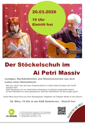 Für Freitag, den 20. März 2026, um 19 Uhr, lädt die Bücherei Oedekoven zu einem unterhaltsamen und abwechslungsreichen Leseabend ein. Unter dem Titel „Der Stöckelschuh im Ai Petri Massiv“ präsentiert die Reiseleiterin und Autorin Ulrike Maria Hund humorvolle, nachdenkliche und staunenswerte Geschichten.