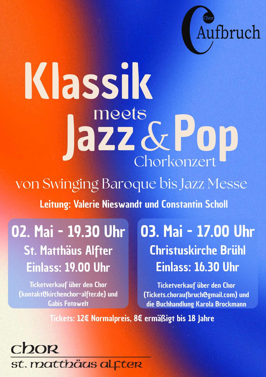 erzliche Einladung unseres Chores St. Matthäus Alfter gemeinsam mit dem Chor Aufbruch aus Brühl zur Aufführung der Konzerte "Klassik meets Jazz & Pop". In der Pfarrkirche Alfter führen wir am Samstag, den 02. Mai 2026 um 19:30 Uhr und in der Christuskirche in Brühl am Sonntag, den 03. Mai 2026 um 17:00 Uhr unter der Leitung von Constantin Scholl und Valerie Nieswandt diese wunderschönen Werke auf. Die Vorbereitungen und Proben laufen auf Hochtouren. Der Kartenvorverkauf hat bereits begonnen: bei allen Chormitgliedern, Gabis Fotowelt in Alfter. Karten können auch gerne unter kontakt@kirchenchor-alfter.de reserviert oder bestellt werden.