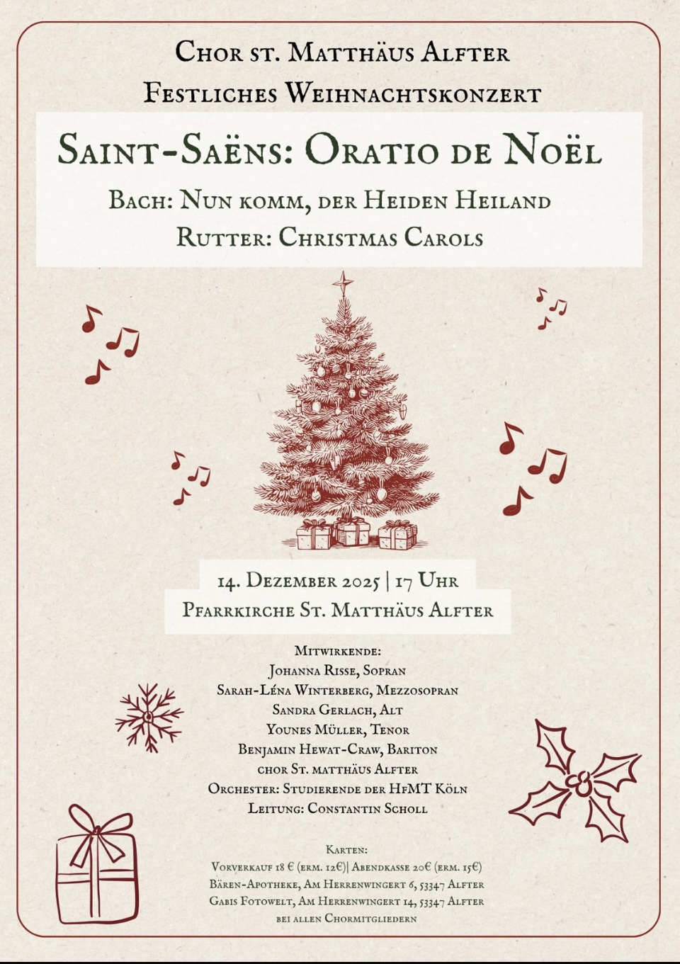 Herzliche Einladung unseres Chores St. Matthäus Alfter zur Aufführung des FESTLICHEN WEIHNACHTSKONZERTS. In der Pfarrkirche Alfter führen wir am Sonntag, den 14. Dezember 2025 um 17 Uhr unter der Leitung von Constantin Scholl mit Solisten und Orchester diese wunderschönen Werke auf. Die Vorbereitungen und Proben laufen auf Hochtouren. Der Kartenvorverkauf hat bereits begonnen: bei allen Chormitgliedern, Gabis Fotowelt in Alfter und der Bärenapotheke in Alfter. Karten können auch gerne unter kontakt@kirchenchor-alfter.de reserviert werden.